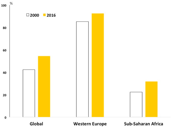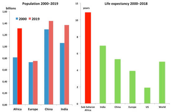 Sub-Saharan Africa (SSA) demography has deeply changed in the last decades. Interactions among environmental determinants also are incriminated in changes of disease burden. The SSA population almost doubled in the last 20 years, from 660 million to 1.1 billion people [1]. Life expectancy is 61 years (80.6 in high income countries—HIC, as in Europe in 1950 [2,3]), 10 years more than in 2000 [2] (Figure 1).