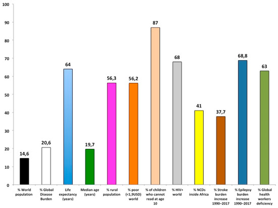This deep demographic change has increased the burden of noncommunicable diseases (NCDs) that today are responsible for more than 40% of the total disease burden in SSA [4,5]. The rise of stroke and epilepsy is alarming: from 1990 to 2017 disability-adjusted life years (DALYs) increase for stroke was +37.7% and epilepsy 68.8% [4]. Stroke and epilepsy can be largely prevented and treated in SSA and deserve more attention (Figure 2).
