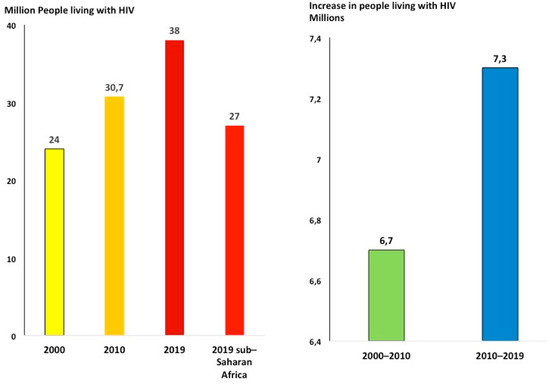 The double burden of HIV and stroke and epilepsy challenges patients, health care services, and governments in SSA. It has been shown that HIV infection is a risk factor for stroke [9] and epilepsy [29] even when viral load is undetectable. Small amounts of virus remain in the nervous system of HIV patients permanently to interfere to various extents with normal functioning of neurons, glial cells, and vessels, thus predisposing millions of HIV patients to neurologic disorders [30]. The lasting HIV pandemic will further increase the burden of stroke and epilepsy in SSA. In fact, the total number of people living with HIV (PLWH) continues to increase as the result of longer life expectancy due to more effective antiretroviral treatment regimens and the decreased occurrence of new infections [31,32]. New HIV infections decreased from 1.9 in 2015 to 1.7 million in 2019, about a 2%/year reduction rate [33]. At this rate, in 2050 new infections will still be about 1 million/year. On the other hand, the number of PLWH continued to increase from 30.7 in 2010 to 38 million in 2019, even faster than what has been observed from 2000 (24 million) to 2010: 7.3 million increase from 2010 to 2019 and 6.7 million from 2000 to 2010) [33] (Figure 4). In 2019, there were 26 million PLWH in SSA (68% of the total) [31].