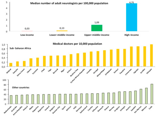 Health work force in sub-Saharan Africa. Upper panel. Shortage of neurologists in low-income countries (ref. [38]). In 23 African nations, there was one neurologist per 5 million population (From: Bower, J.H.; Zenebe, G. Neurology 2005, 64, 412–415, doi:10.1212/01.WNL.0000150894.53961.E2). Lower panel. Number of medical doctors in sub-Saharan Africa compared to high income and other countries (http://apps.who.int/gho/data/node.main.HWFGRP_0020?lang=en, last accessed on 12 January 2021).