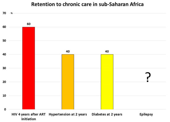 Percentage of patients under treatment after initiating chronic treatment in sub-Saharan Africa. The insufficient retention to chronic care hampers scaling up of treatment against HIV, hypertension, diabetes (ref. [50,51,52]). The insufficient retention deeply affects stroke prevention and epilepsy management.