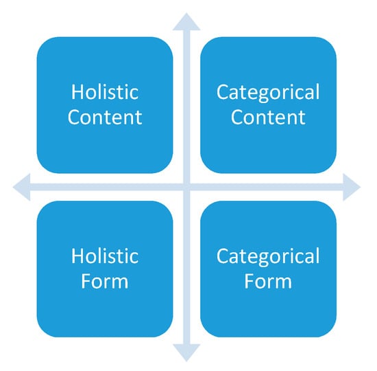 Narratives can be analyzed in different ways, in two main dimensions: (a) thematic versus holistic approaches and (b) content versus form (see Figure 1) []. Polkinghorne (1995) describes the first dimension as distinguishing “the analysis of narratives” and “narrative analysis” [].