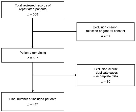 This single-center retrospective cross-sectional study was based on the demographic- and health-related data of 447 patients. We analyzed all patients over 16 years of age who were repatriated from foreign countries to the Inselspital emergency department in Bern from January 2013 to December 2018. Children under 16 years were not included, as they were admitted to a separate emergency department. No individual informed consent was obtained, yet patients who actively refused a general consent (GC = general consent) were excluded from the study (n = 31). Another 60 cases were excluded due to duplication of cases or incomplete data (cases with >50% missing data). Therefore, 447 cases were included in the study (Figure 1).