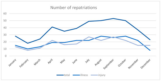About half of all patients were repatriated due to illness (n = 232, 51.9%) and the other half suffered an injury (n = 215, 48.1%).