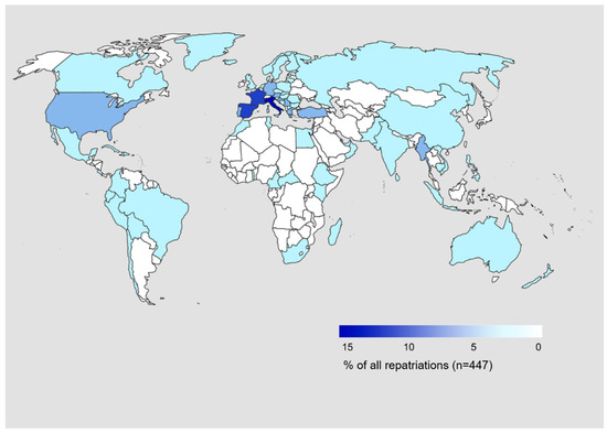 Patients were repatriated from a total of 74 countries worldwide. Overall, 78.8% of patients were repatriated from European countries (n = 352) and 8.1% from Asian countries (n = 36). The top five countries patients were repatriated from were Italy, Spain, France, Germany and Austria (Table 2). Figure 3 gives an overview of the countries with the percentage of patients that were repatriated from each country.