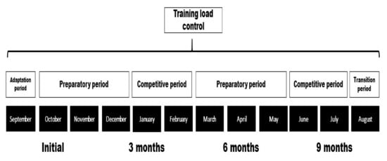 Periodisation of the different training loads that runners perform, changes in volume and intensity during the sports season, influence the adaptations and performance in the runners []. There are few longitudinal studies in homogeneous groups of runners that include different evaluation moments and have investigated the changes in anthropometrics and performance parameters throughout a sports season as a consequence of the training sessions performed [].