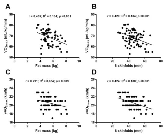 Linear regressions of significant correlations between performance parameters and anthropometric values. (A): linear regression between fat mass and VO2max; (B): linear regression between ∑6 skinfolds and VO2max; (C): linear regression between fat mass and vVO2max; (D): linear regression between ∑6 skinfolds and vVO2max; r: Pearson’s coefficient of correlation; R2: coefficient of determination; p: p-value; VO2 max: maximal oxygen consumption; vVO2 max: running speed at maximal oxygen consumption.