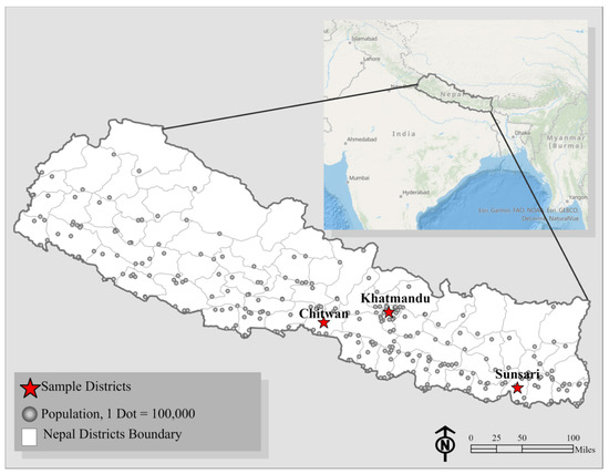 A cross-sectional survey tool was developed by our research team and influenced by different journalist surveys, including the Association of Health Care Journalists Member Survey [35] and the Pew Research Center Journalist Survey [36]. The initial survey was first drafted in English, edited as a team, and driven by our research objective to describe the national media environment of health reporting in Nepal with a One Health framework by capturing journalists’ public, animal, and environmental health reporting habits. It was then translated into Nepali through a blind back technique with a focus on ensuring comprehensibility, cultural competency, and One Health applicability. Journalists’ contact information was received from the Ministry of Health and Population in Nepal through a collaboration with the National Health Education, Information and Communication Center. To help obtain a representative sample of health journalists in large population centers with a rich history of environmental and animal health reporting, participants were recruited from three diverse districts (Kathmandu, Chitwan, and Sunsari) across Nepal. The West, Midwest and Far-Western regions were not specifically targeted due to smaller overall populations and a lower number of diverse health journalists in these areas. Sampling locations are shown in Figure 1, along with population densities for reference. Journalists were invited to attend a local information session where the study was introduced, and the survey tool was administered. Potential participants were also encouraged to invite colleagues who frequently reported on health matters. Written informed consent was communicated in English and Nepali, then signed and documented by each participating journalist. Inclusion criteria required participants to be journalists living in Nepal who reported on health events.