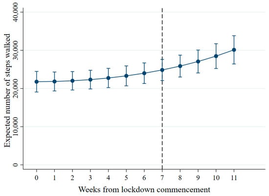Comparing PA before and during COVID-19 restrictions, previous studies have generally shown declines in PA among student populations [,,,]. We extended these findings by demonstrating an increase in steps walked from the commencement of lockdown onwards and subsequent easing of restrictions, as might be expected. This likely reflects increasing certainty and clarity over restrictions, and the gradual relaxation of rules permitting more outdoor activities and meeting friends []. Reductions in PA usually observed during lockdown may therefore be temporary [,,,], with students returning to higher levels of PA when permitted, although further research able to leverage pre-lockdown PA data would be needed to confirm this. This would be a positive finding, as PA is associated with long-term positive health outcomes, including mental well-being [].
