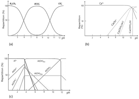 Variation of (a) carbonate, (b) calcium, and (c) aluminum species with pH [39,43,46,47].