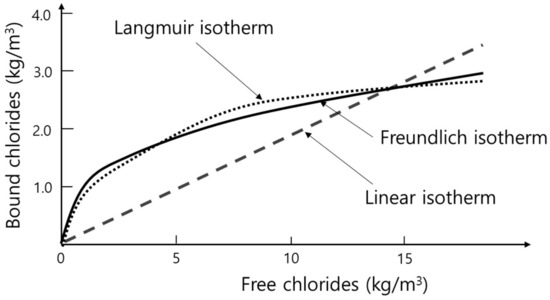 where Cb and Cf represent the concentration of bound and free chlorides, respectively. k indicates a constant. It is generally accepted that the linear isotherm is effective when the concentration of free chlorides is lower than 20,000 ppm [15]. As shown in Figure 2, the linear binding isotherm overestimates bound chlorides at a high concentration of free chlorides, while the isotherm underestimates bound chlorides at a low concentration [72].