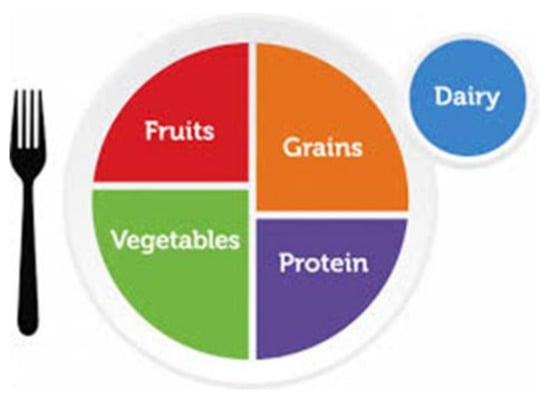 MyPlate (Figure 1) was created to substitute the US Dietary Pyramid in 2011 resulting in the ending of 19 Dietary Pyramids since 1992 [4]. MyPlate is the representation of a plate setting with a glass that includes five groups: grains, vegetables, fruits, protein foods, and dairy. Several strengths have been identified in how MyPlate is represented: (1) MyPlate has been adapted to cover the needs of pregnancy and breastfeeding, toddlers, children, adults, and older adults and thus is more precise in its recommendations across the life cycle [4]; (2) the web site created by USDA also provides a list of recipes and innovative ways to follow MyPlate; (3) MyPlate also recommends moderate to vigorous physical activity 150 min per week [5]. Further, studies have shown that following MyPlate contributes to the maintenance of a healthy body weight plus a lower risk of hypertension in adults over 50 years of age [6]. MyPlate also recommends more satiating foods to treat obesity rather than caloric counting. The key messages from MyPlate are to follow a healthy eating pattern that supports adequate nutrient intake to prevent the risk of chronic disease; to focus on a variety of nutrient dense foods; to limit calories from added sugars, saturated fat, and sodium; and to shift to healthier beverage choices.