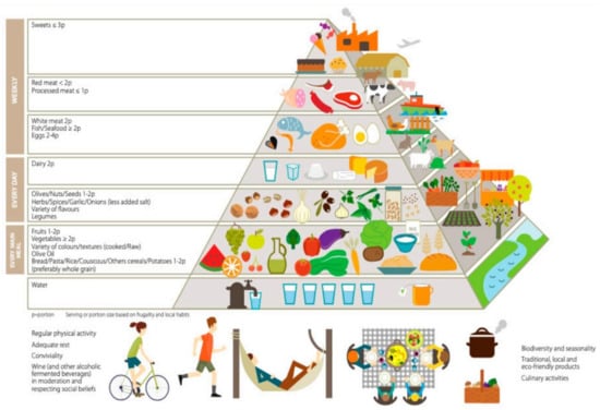 Serra-Majem et al. recently reported the updated Mediterranean Diet Pyramid (MDP) (Figure 3) [8], a sequel of the previous study by Bach-Faig et al. [9], which summarized and updated the traditional Mediterranean Diet (MD) of those basin areas that have developed with modernization. This region includes all the countries that surround the Mediterranean Sea: France, Portugal, Italy Spain, Greece, Malta, and Cyprus, which is characterized by specific climate and by a biodiversity of species [10].