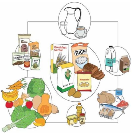 Food groups are not written on the FBDG image itself; however, they are otherwise indicated in the accompanying FBDG [16]. As exemplified by ethnically varied staples such as corn meal, rice, potatoes, and bread, the main group includes distinct grains and starches. These starchy foods make up the largest of the seven circles, a relatively large part of the proposed South African diet. In the next larger circle, fresh fruits and vegetables are pictured; the overall amount ingested should be somewhat equal to that of starches, since the circle is somewhat narrower. By analogy, legumes, animal proteins, and dairy products, as indicated by their smaller circle sizes, are to be eaten in comparatively smaller volumes. The South African model illustrates socio-economic facts and accessibility problems, as numerous items are sold in boxes, bags, cans, plastic jugs, and cartons, since not everybody can afford fresh ingredients. Fats and oils make up the smallest group, while water and tea are placed at the top. Compared to other dietary guidelines, the FBDG shows the relevance of daily water consumption by placing the image at the top of the graph.