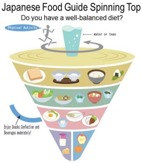- Yoshiike, N.; Hayashi, F.; Takemi, Y.; Mizoguchi, K.; Seino, F. A new food guide in Japan: The Japanese food guide Spinning Top. Nutr. Rev. 2007, 65, 149–154. [Google Scholar] [CrossRef] [PubMed]