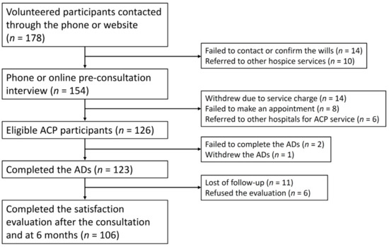 A flow diagram of the study is exhibited in Figure 1. A total of 178 potential participants contacted the study nurses for ACP consultation. Of these, 154 participants completed pre-consultation interviews. Eventually, a total of 126 participants took part in an ACP consultation, however, only 123 had completed the ADs and were eligible for the analysis and follow-ups, which led to an AD completion rate of 97.6%. The monthly average was 10.5 participants, which was nearly one-twelfth of all outpatient visits in the collaborative palliative care clinics and half of those who registered a preference for palliative care at EOL in the study hospital. The median age of the participants was 60.8 years, 64.2% of whom were female. Most of the participants lived in non-urban regions (suburban, 56.8%; country, 26.0%). The majority of them were married or cohabitating, and approximately half had a college degree or above. Among the participants, only 8.9% had a presenting major illness (malignancy, n = 7; rheumatological disorders, n = 4) and 65.9% did not have any chronic illnesses. Very few participants had signed wills for palliative care, do-not-resuscitate (DNR) order, or cadaveric organ donation (18.7%, 13.0%, and 11.4%, respectively) (Table 1).