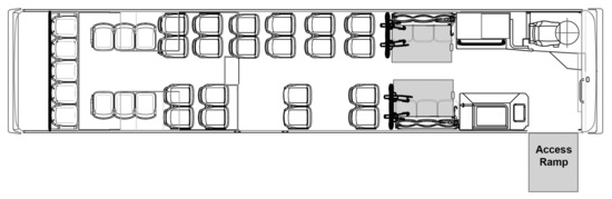 Plan view of interior configuration of the low-floor bus used in the study. The grey rectangles indicate the wheelchair access ramp at the front door for ingress–egress, and two forward-facing wheeled mobility securement areas in the bus interior.