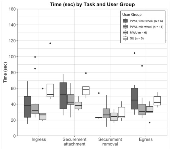 Average ± SD times for ingress and egress were s and s, respectively. Average ± SD times for securement attachment and removal were s and s, respectively. Box-plots for ingress, securement attachment and removal by the bus driver, and egress times indicated high variability within user group (Figure 3).