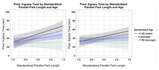 Regression analyses yielded reduced models with significant interaction effects of standardized age and parallel park length on ingress times , and on egress times (Table 5). Figure 4 depicts the simple slope of the regression of ingress time (left-panel) and egress time (right-panel) by standardized parallel park length for three age values: average (0), −1 SD younger, and +1 SD older. Ingress and egress times increased significantly with increases in age and parallel park length. Compared to an average ingress time of 29.6 s for users of average age and short parallel park length (−1 SD), a +1 SD increase in parallel park length was associated with an increase in ingress time by: