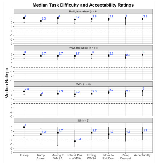 Figure 5 depicts the median ± 90% CI for the task difficulty and overall acceptability ratings. Median task difficulty ratings for front- and mid-wheel drive PWU and MWU ranged between +2 (easy) and +3 (very easy), with the lowest ratings being for ramp ascent by MWU with a median of +2 (90% CI: +0.4, +3.0). With the exception of maneuvering at the bus-stop (median: +3), task difficulty ratings for SU were generally lower with medians ranging between +2 (easy) and −1 (moderately difficult). The task of entry and positioning in the WMSA had the lowest median rating (higher difficulty) of −0.3 (90% CI: −1.5, +2.4), with a significant difference among user group () (Table 6). Corresponding pair-wise post hoc tests indicated significantly lower difficulty ratings (greater difficulty) for SU compared to front-wheel drive PWU (). None of the other comparisons were statistically significant. Overall acceptability ratings for the entire trip were slightly lower and more diverse for SU with a median of +1.7 (90% CI: 0.0, +3.0) compared to ratings for users of manual and powered wheelchairs (Figure 5), however, the differences were not statistically significant (Table 6).