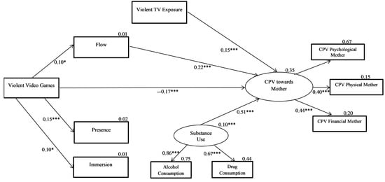 On the other hand, the model also showed the existence of the direct relationship between exposure to violence on television and substance use and the total CPV against the mother (β = 0.15, p < 0.001, and β = 0.51, p < 0.001). However, the relationships of the consumption of violent video games with absorption, presence, immersion, and of absorption with the total CPV were nonsignificant. Similarly, relationships between the participant’s sex and the four variables of engagement and total CPV were also nonsignificant.