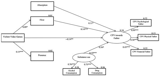 With regard to CPV against the father, the model showed that higher rates of consumption of violent video games were related to higher levels of flow (β = 0.10, p < 0.05) and presence (β = 0.12, p < 0.01). Flow and absorption, on the other hand, were directly related to higher levels of total CPV against the father (β = 0.18, p < 0.001, and β = 0.15, p < 0.01, respectively). Finally, substance use was directly related to higher scores in total CPV (β = 0.48, p < 0.01).