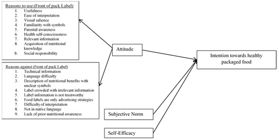 Figure 1 represents the graphic relationship among all variables in the current study. The model was supported by BRT [53]. The inconsistent results of past studies regarding the attitude to consult food label information at point of purchase encouraged the authors of the current study to examine the reasons which influence consumer attitude and reasons which create barriers for consumers to consult label information at the point of purchase for healthy packaged food. Therefore, the authors of current study identified nine reasons which can motivate consumers to consult food label information for healthy packaged food and nine reasons which discourage consumers from consulting food labels for healthy packaged food selection. Moreover, consumer decisions towards the selection of any object are influenced by influential members of society like parents, friends, peers and other opinion leaders [54]. According to Ajzen these opinion leaders are called the “subjective norm” [55]. Therefore, the author of the study employed subjective norms to examine their role in the selection of healthy packaged food. Although there are multiple external factors which affect consumer decisions and intention, nevertheless, consumer self-decisions significant. Therefore, the current study involved the self-efficacy factor to examine its impact on consumer healthy packaged food selection intention.
