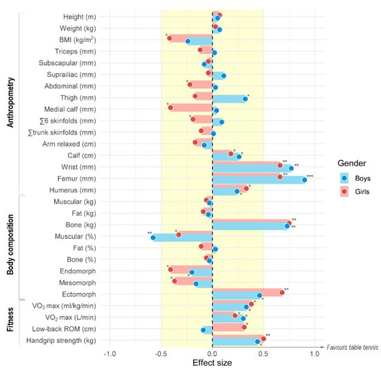 Table tennis players showed superior fitness levels as compared to physically active children, with greater maximal aerobic capacity (MD (95% CI) = 0.48 to 1.92 mL·kg−1·min−1, ES = 0.34 in boys; 0.57 to 1.83 mL·kg−1·min−1, ES = 0.39 in girls) and handgrip strength (MD (95% CI) = 0.87 to 2.33 kg, ES = 0.44 in boys; 1.01 to 2.39 kg, ES = 0.50 in girls). Low-back ROM was considerably altered by sex, with girls showing greater values than boys. In particular, girls from the table tennis group exhibited greater results than physically active comparators (MD (95% CI) = 0.71 to 3.29 cm, ES = 0.32).