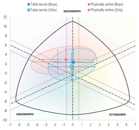 Somatochart of boys and girls aged 10–11 years who regularly practice table tennis against those who are physically active but not engaged in a regular activity. Error bars are standard deviations.