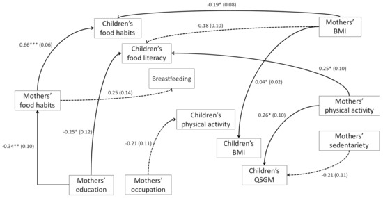 Interactions between maternal and their children food and PA habits. Note: Path coefficients are presented as standardised regression weights and standard errors in parenthesis. Only significant relationships are showed; asterisks indicate the significance level (* p-value < 0.05; ** p-value < 0.01; *** p-value < 0.001). The dashed lines represent relationships with a significance level slightly above 0.05 (mothers’ BMI/children’s FL score p = 0.080; mothers’ occupation/children’s PA p = 0.061; mothers’ sedentariness/QSGM p = 0.053; mothers’ food habits/breastfeeding p = 0.073). BMI: body mass index; QGMD: quotient of gross motor development.