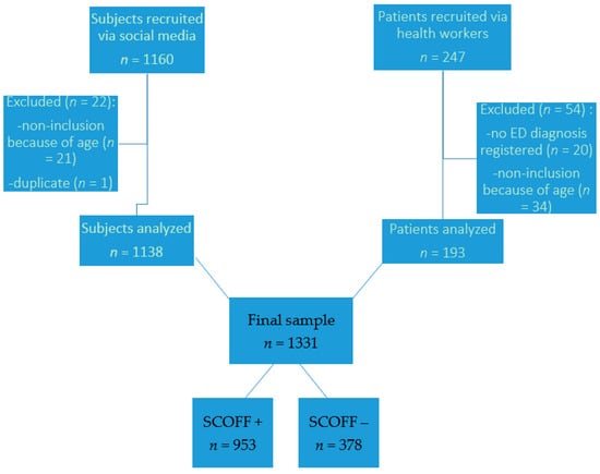In total, 1407 questionnaires were completed, and 1331 were analyzed. A total of 1138 subjects were from the general population, and 193 were ED patients recruited via health workers. Seventy-six completed questionnaires (5.4%) were excluded from the analysis because they did not match the age criteria or because their ED diagnosis was not communicated (for ED patients recruited via health workers). Figure 1 represents the study’s flowchart.