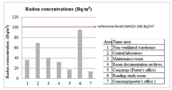 There has been little research on indoor radon concentrations in Spanish workplaces. No data are available on radon concentrations in workplaces in the University of Granada, prompting this pilot study in three different building of the institution. Mean accumulated radon concentrations detected in this study ranged between 12 and 95 Bq/m3, below the maximal level set by the WHO. The highest radon concentrations were found in the Royal Hospital, an old building made of stone, in agreement with previous findings on the influence of stone-based interior and exterior building materials on indoor radon concentrations []. The lowest indoor radon values were observed in ventilated areas, regardless of the age of the building.