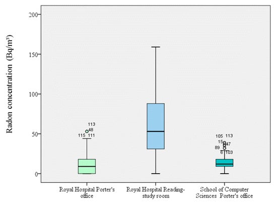 Among the areas measured on the ground floor in the three university buildings, radon concentrations were more than five-fold higher in the reading/study room of the Royal Hospital (95 ± 46) Bq/m3 than in the Porter’s offices in the same building (17 ± 17) Bq/m3 and the School of Computer Sciences (14 ± 8) Bq/m3 (Figure 1). Overall, radon concentrations were around two-fold higher in areas located in the basement (School of Sciences) than in those on the ground floor (Royal Hospital and School of Computer Sciences). It has previously been reported that concentrations of this gas are almost two-fold higher on the second floor of buildings than on lower floors []. Mean radon concentrations were higher in the 15th century building than in the more modern constructions, although this may also be influenced by differences in their ventilation (Figure 2). Lee et al. found no statistically significant correlation between radon concentrations and year of construction, although European reference levels differ between new buildings (200 Bq/m3) and existing buildings (400 Bq/m3) [,].