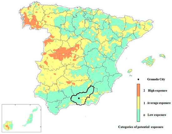 Map of exposure to radon-CSN (Spanish Nuclear Safety Council). The province of Granada is demarcated with a black line, and the capital (Granada) is indicated with a black dot. http://www.csn.es/en/mapa-de-exposicion-al-radon-en-espana (accessed on 22 April 2019).