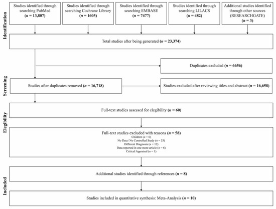 Up to 3 May 2020, 10 studies [91,92,93,94] involving 353 controls and 368 HBO treated patients were included using the search strategy described. The total study number generated was 23,374. The review of the titles and abstracts, excluding duplicates and according to the inclusion and exclusion criteria, resulted in the exclusion of 23,314 articles. A full-text review of the remaining 60 items resulted in selecting the final ten studies, representing one American, one Israeli, one Taiwanese, and seven Chinese papers. All the studies were cohort studies.