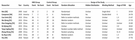 The current meta-analysis results indicate that HBO therapy in the treatment of femoral head necrosis can significantly improve patients’ clinical outcomes through its therapeutic and pleiotropic effects. Both Asian and non-Asian populations can benefit from this method.