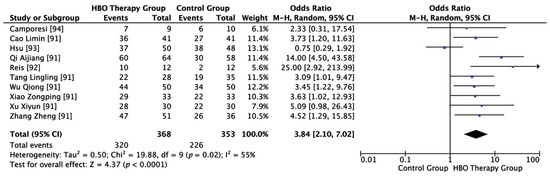 As shown in Figure 3, a total of 368 cases and 353 controls were included. Statistical analysis showed that I2 = 55%, p = 0.02. There is substantial heterogeneity, so the random effect model is adopted. Random effects model meta-analysis showed that clinical efficacy in the HBO group was 3.84 times higher than in the control group, and the difference was statistically significant (OR = 3.84, 95% CI (2.10, 7.02), p < 0.00001).