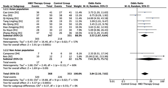 As shown in Figure 4, according to the subgroup analysis principle, the population was divided into Asian and non-Asian subpopulations. Among the included studies, eight refer to Asian populations and two to non-Asian populations. For the Asian subpopulation, random effect model meta-analysis showed that I2 = 57%, p = 0.02, and clinical efficacy in the HBO group was 3.53 times higher than in the control group, and the difference was statistically significant (OR = 3.53, 95% CI (1.87, 6.64), p < 0.00001). For the non-Asian subpopulation, random effect model meta-analysis showed that I2 = 60%, p = 0.11, and the clinical efficacy in the HBO group was 7.41 times higher than in the control group but the difference was not statistically significant (OR = 7.41, 95% CI (0.73, 75.71), p = 0.09).
