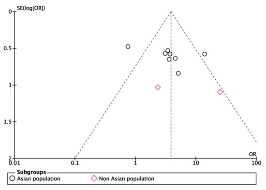 Statistical analyses were conducted using Review Manager (RevMan [Computer Program] —version 5.4.0; The Cochrane Collaboration, 2020). An OR and 95% CI were used to analyze the statistical data. Χ2 tests evaluated the heterogeneity of the included articles. According to epidemiologic literature, when the study was statistically homogeneous (p > 0.1, I2 < 50%), a fixed-effects model was used for meta-analysis; if there was statistical heterogeneity among the studies (p < 0.1, I2 > 50%), the random-effects model was used. Subgroup and publication bias analyses were also conducted.