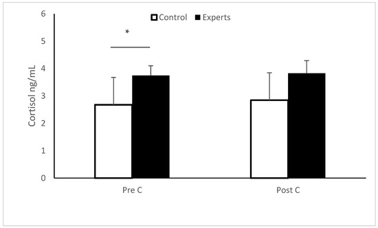 Mean ± SD for salivary cortisol levels between control and experts players. Pre C = pre-competitive salivary cortisol levels; Post C = post-competitive salivary cortisol levels. * p < 0.05.