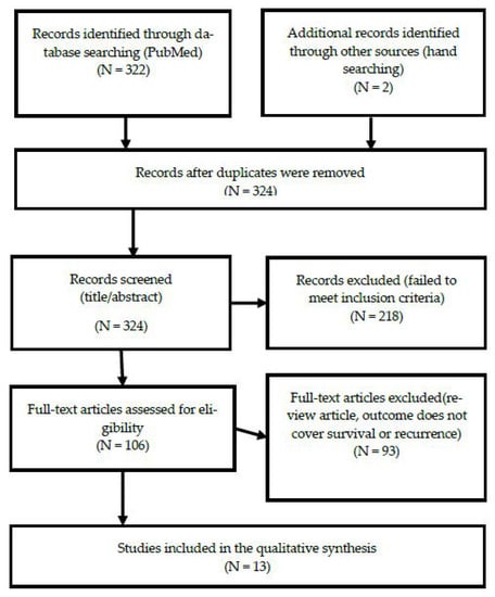In the first screening process, the title and abstract were checked according to the study’s inclusion and exclusion criteria. This resulted in the exclusion of 218 papers, leaving 106 papers. The first screening included papers published in academic journals, research on colorectal cancer patients, papers related to physical activity and the prognosis of the subjects, and papers published over the last 10 years (from January 2010 to December 2019). The first screening process was completed by excluding papers that either did not meet the inclusion criteria of being written in English or did not have abstracts.