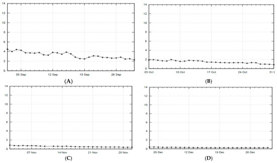Scope of the UV index for the city of Gdynia (Poland) in the research period ((A)-September, (B)-October. (C)-November, (D)-December) [27].