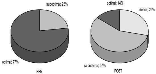 At the end of summer (PRE), most of the footballers tested had an optimal serum concentration of 25(OH)D in the blood. No player showed a deficit value. After three months, at the end of autumn, significant changes in this indicator were recorded. The deficit was reported in 29% of the footballers, and no optimal values were found in the study group (Figure 2).