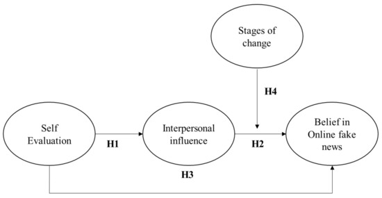 Studying the phenomenon of online fake news in the food sector is certainly complicated because it requires the consideration of different structural, individual, and social factors, and it may be influenced by the specific life moment the individual is experiencing in relation to his own lifestyle. It has been demonstrated that individual psychological and social factors are more relevant in explaining this behavior more than structural elements, such as the time spent using social media [6]. In particular, some studies demonstrated that when people have low self-esteem and a negative perception of self-concept, they seek confirmation of their behavior in others, becoming more susceptible to interpersonal influence [11,12]. Moreover, people who are more predisposed to interpersonal influence are also more likely to believe and share the information given by others even if the information is false because this allows them to increase their social affirmation and improve their self-esteem [13]. From these premises, it is assumable that the interpersonal influence could mediate the relationships between self-evaluation and the believing in fake news. In support of this assumption, some studies affirm that it is not the level of self-esteem that directly determines the persuasive power of fake news but it is the necessity to improve self-perception that leads people to become more prone to follow the opinions and advice of others (interpersonal influence) in order to find a social consensus [14]. Moreover, as suggested by the Transtheoretical Model [15] the search for information plays a different role according to the stage of change in which the person is. In particular, this model is composed of five incremental stages of change in an individual’s behaviors and lifestyle (i.e., precontemplation, contemplation, preparation, actions, maintenance) that allow identifying different phases of lifestyle change. In particular, according to this theory, during the preparation and actions stages, individuals need to consult and interact with external information sources (such as friends, relatives, blogs, forums, etc.,) in order to be motivated to continue the change process and maintain it over time. Applying this model on lifestyle change, some scholars discovered how people modify their openness to external information and the way of seeking and using information based on specific life moment that the individual is experiencing in relation to his own lifestyle [16]. Specifically, this research discovered that people who are in a stage of changing their lifestyle (preparation and action stages) are more predisposed to being socially influenced by external sources and in particular this orientation led them to believe more in online news (even if false) than those who are not in these stages. These results pointed out how the belief in online fake news could be amplified by the motivation of change lifestyle.