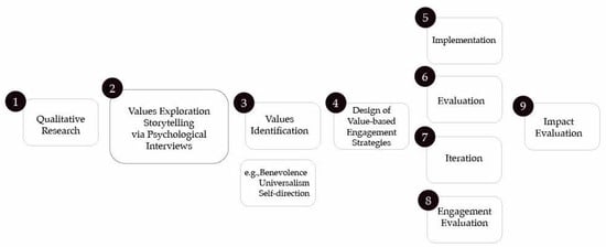 The current paper addresses the first four steps of the proposed Value-Based Framework for Community-Centered Research in depth—i.e., qualitative research, values exploration, values identification, and design of value-based engagement strategies. These first four steps provide an opportunity to honor, focus, and reflect on the experiences of those most directly affected by issues in our communities enhancing connection and trust between community members and all the stakeholders involved in a given community research project [3]. Although steps 5 to 9 (implementation, evaluation, and impact factors related to community engagement strategies) are beyond the scope of this manuscript, they constitute integral next steps of value-based community-centered research; thus, they are shown as part of the overarching framework in Figure 1. Through in-depth interviews and empathic listening, the current study aimed to uncover research participants’ values that could inform the development of community engagement strategies embodying these values.