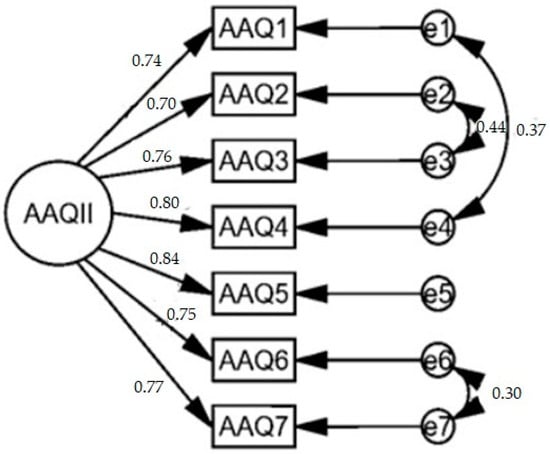 Previous studies had only detected correlated errors between items 1 and 4 [,,,,], 2 and 3 [,], and 2 and 5 [] but failed to detect errors between items 6 and 7. The incorporation of these correlated errors resulted in a model with a better fit to the data than that originally proposed by Bond et al. [] and Ruiz et al. []. The factorial structure remained invariant in men and women []. Gender differences in AAQII scores suggest differences in psychological inflexibility instead of a bias in the measurement itself [].