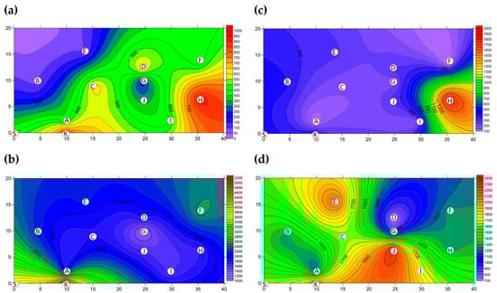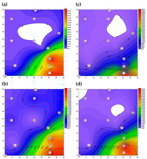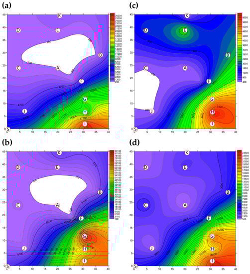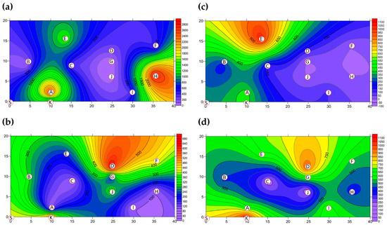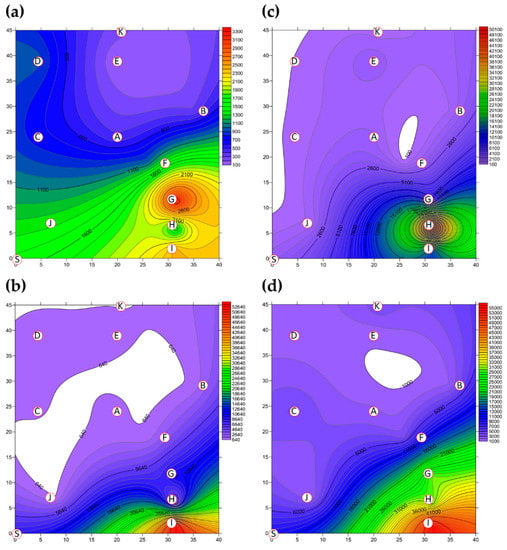 The FBs (CFU m−3) present as (a) LPBs and (b) SPBs in Market A before operations commenced and (c) LPBs and (d) SPBs present after operations had finished. Red circular dots with English titles represent the sampling locations. The bioaerosol levels in the areas marked in white are below the cutoff level.
