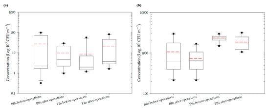 Secondly, the difference in occupancy number between the two markets is likely to have influenced the bioaerosol concentrations at these two sites. Market B has a higher occupancy area, 16.25 m2 on average for each vendor, and this could have increased the humidity and temperature, thus affecting the bioaerosol concentration present in this market compared with market A, which has an average area of 13.88 m2 for each vendor (see Table S1). However, the ventilation system at each market seems to play a very important role because it provides fresh air continuously, which help to control the concentration of bioaerosols present in the two TMWs. Traditional ventilation fans in Market A are operated continuously until they are destroyed and do not undergo a cleaning and maintenance process. Thus, high levels of BBs and FBs accumulate in the fans of Market A due to poor air exchange. On the other hand, all of the air-conditioner filters of Market B are washed or replaced once per month. Motors in the ventilation system also undergo a detailed check and maintenance process. Market B has relatively low levels of BBs, but these units might not be able to effectively remove FBs and PM10 under conditions of high relative humidity [38].