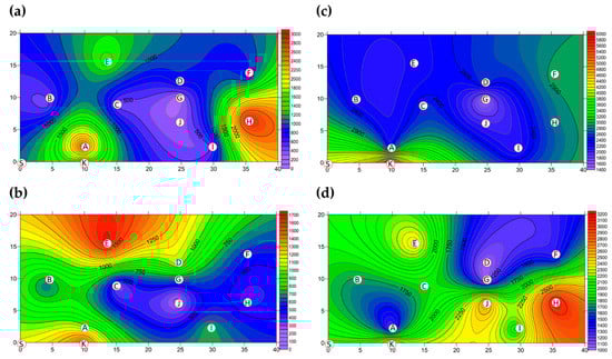 The two-dimensional distribution of BBs in Market B is shown in Figure 4. The total BB concentration present in Market B before operations commenced is shown in Figure 4a and Figure S2. The hotspots with their percentages of total BBs were the grocery district (District B-H, 28.00%) and the grain district (District B-A, 25.00%), which were measured to be 2.65 × 103 CFU m−3 and 2.96 × 103 CFU m−3, respectively, while bioaerosols in the other eight districts were within the levels set by Taiwan’s IAQS. The average concentration across all districts of Market B was 1.06 × 103 CFU m−3 before operating, as shown in Figure 3 and Table S2, which was 10 times less than that in Market A. Moreover, the total BB concentration present after operations had finished is shown in Figure 4b. The average concentration of BBs across all districts before market operations began was found to be similar to the concentration aftermarket closure, as shown in Figure 3 and Table S2. The average concentration for the hotspots after operations had been completed was lower at 7.34 × 102 CFU m−3, a reduction of 31% compared to that before market operations began. There were lower levels of BBs in the hotspots after market operation had finished, such as the concentrations in the five districts B-B, B-D, B-E, B-G, and B-I, which were slightly higher when compared to the concentrations before market operations began (see Figure S2). For example, in the livestock fresh raw meat district (District B-D), the bioaerosol level of 8.48×102 CFU m−3 before market operations commenced and this increased to 1.06 ×103 CFU m−3 after market operation had finished. Similarly, the poultry fresh raw meat district (District B-B) had a concentration of 4.24 × 102 CFU m−3 before market operations began and 6.60 × 102 CFU m−3 after market operations had finished.