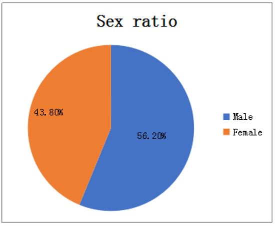 Figure 2. Sex ratio of HFMD patients. - In terms of population types: As shown in Figure 3, there are three types of populations for all patients: kindergarten, scattered living, and other categories. The proportions of patients are 33.6%, 60.2%, and 6.2% respectively. Patients infected with HFMD are mainly concentrated in kindergartens and scattered populations, but the proportion of scattered patients is twice that of kindergarten patients, so the number of children in kindergartens cannot be a good predictor of HFMD infection patients.